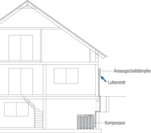 Beim Ansaugen der Frischluft von außerhalb eines Gebäudes entsteht ein Ansauggeräusch, das durch das Ansaugventil verursacht wird. Um dies zu vermeiden empfehlen wir den Einsatz eines Anschaugschalldämpfers, der das Ansauggeräusch auf ein Minimum reduziert.